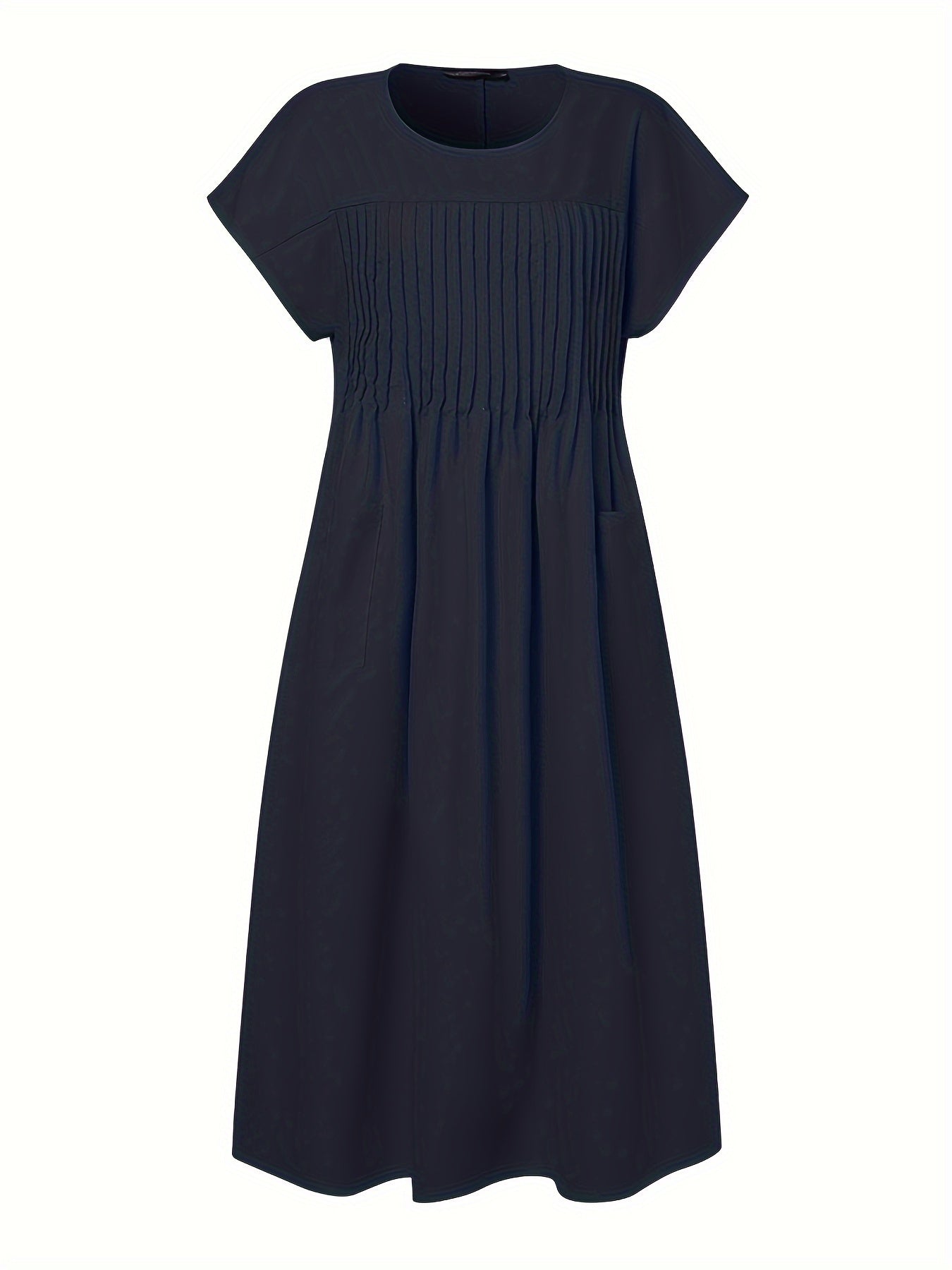 Solid Pintuck Midi Dress, Casual Crew Neck Short Sleeve Dress