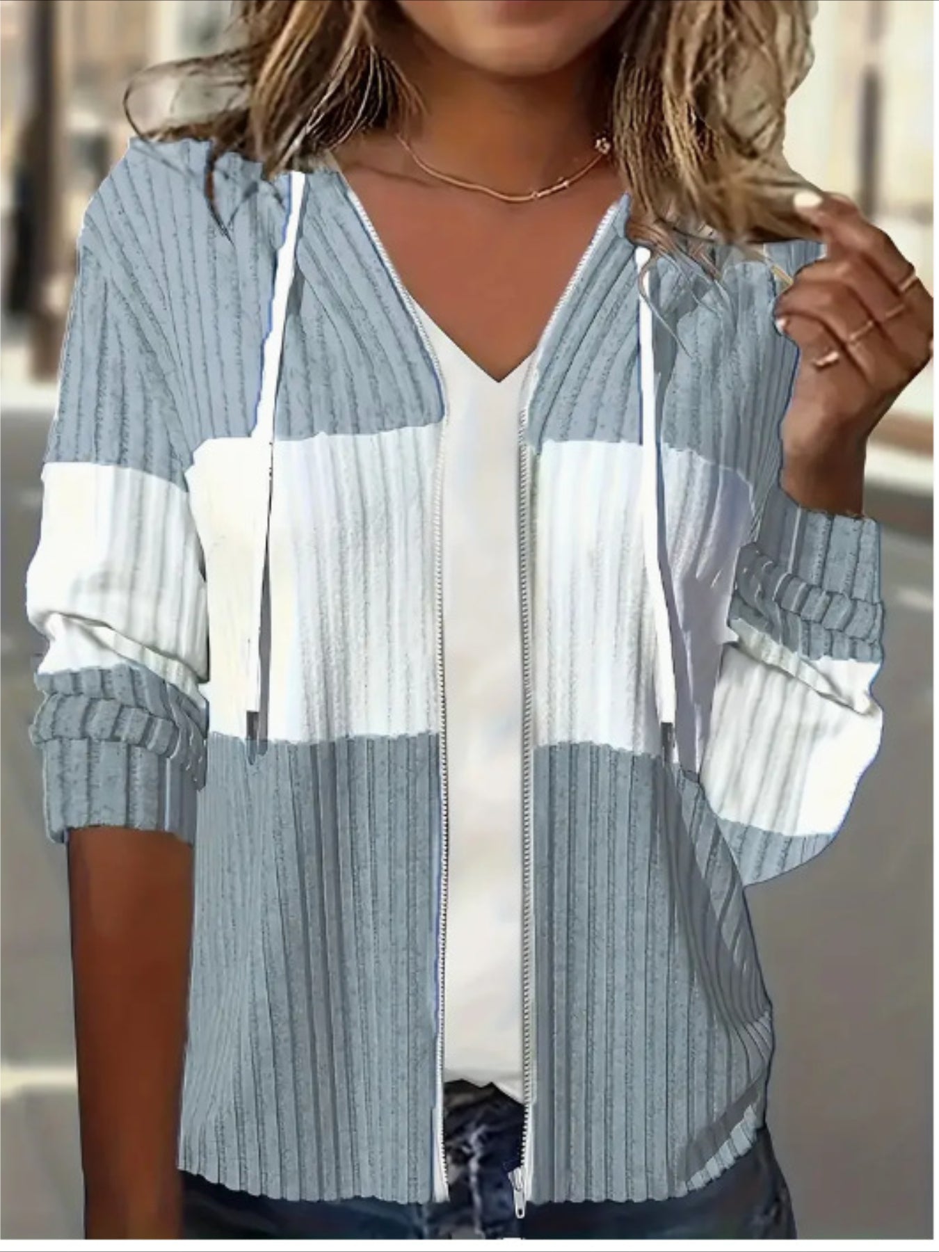 Vibrant Color Block Rib Knit Hoodie - Soft, Cozy, and Casual Long Sleeve Sweatshirt with Drawstring and Zip Up Closure