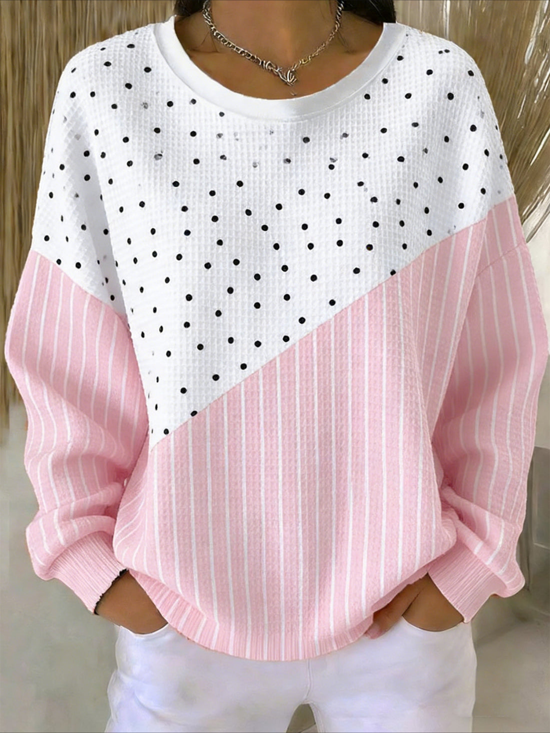 Sale Chic Leopard Print Color Block Knit Sweater - Casual Crew Neck, Long Sleeve Pullover
