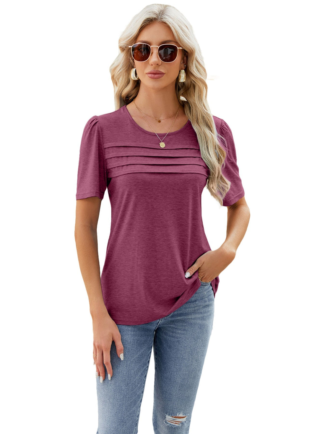 Sale Solid Color Textured Crew Neck T-Shirt, Elegant Ruffle Trim Short Sleeve T-Shirt