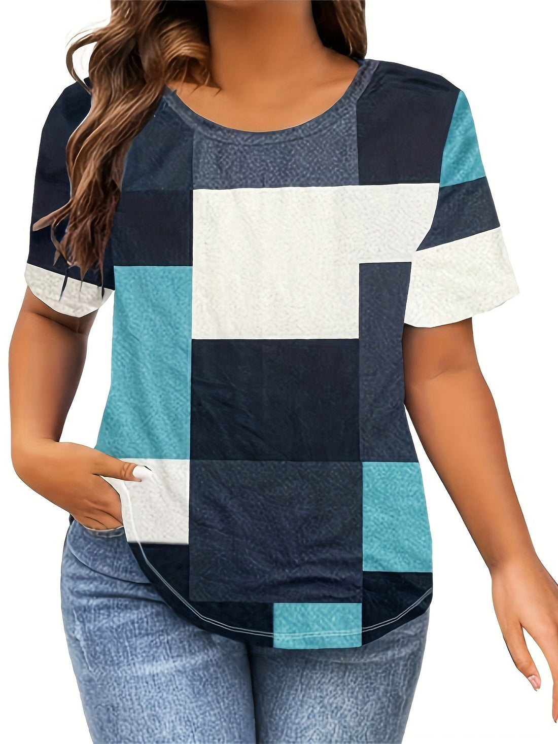 Sale Color Block Print T-shirt, Casual Crew Neck Short Sleeve Top