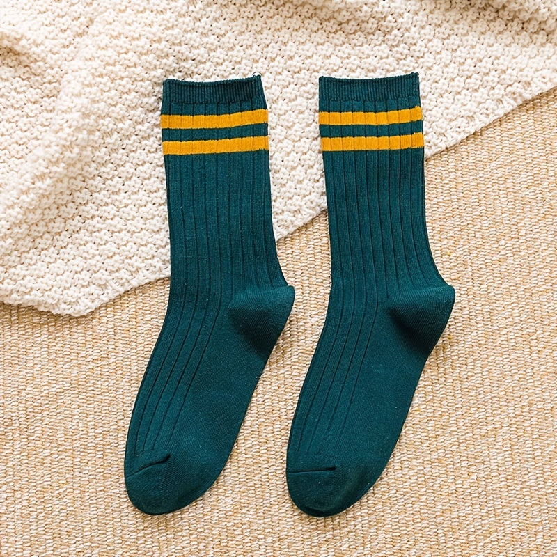 5/10 Pairs Solid Patched Stripes Crew Socks, Basic Sports Business Stockings