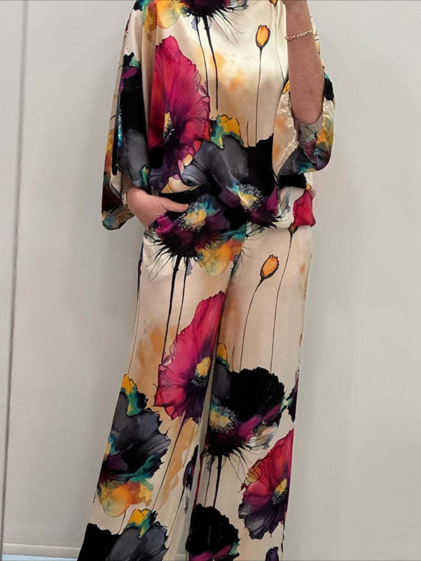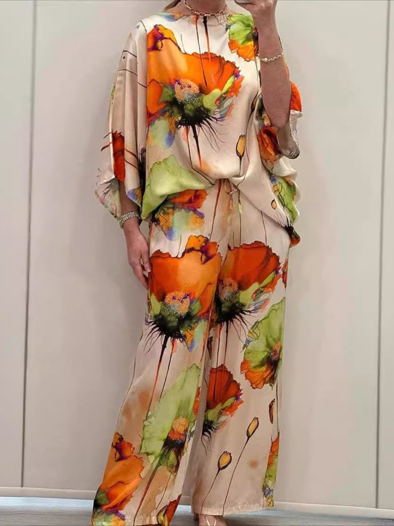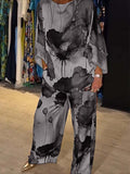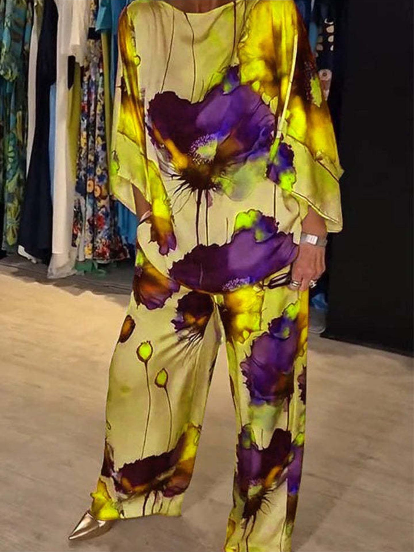 2 Pieces 3/4 Length Sleeve Crew Neck Floral Print Casual Pants Sets