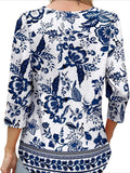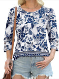 Sale Elegant Floral Print High-Stretch Round Neck Long Sleeve Top