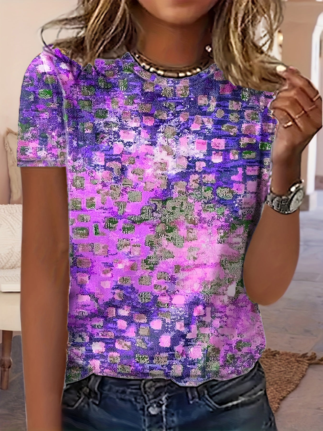 Allover Print Crew Neck T-Shirt, Casual Short Sleeve T-Shirt