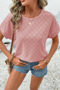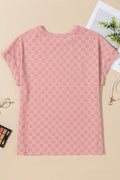 - Stay stylish with this pink womens t shirt.Crafted with a unique checkered texture for a modern look.Classic round neckline for a versatile and timeless appeal.Made with high-quality, breathable fabric for all-day comfort.