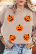 - You’ll love this pumpkin graphic sweatshirt for the Halloween season.Crafted from quality fabric with a twisted ribbed texture in a solid color.There are chenille patched jack-o-lantern pattern on the front.Relaxed sweatshirt for women with a crew neck and drop shoulder look.