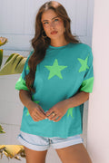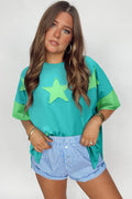 - Trendy oversize T-shirt features a frayed denim star patch for a unique and edgy look.Crew neckline offers a classic and versatile style, perfect for casual outings.Half sleeves provide a relaxed and comfortable fit for all-day wear.Ideal for creating a laid-back yet stylish outfit with a touch of urban flair.