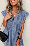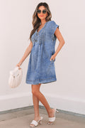Beau Blue Tie V Neck Tucking Detail Short Sleeve Denim Shift Dress