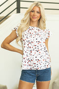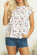 Beige Abstract Print Ruffle Flutter Sleeve Keyhole Back Slim Blouse