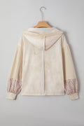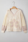 Beige Floral Patched Waffle Textured Colorblock V Neck Casual Hooded Top