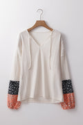 Sale Beige Floral Patchwork Textured Knit Drawstring V Neck Blouse
