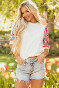 Sale Beige Floral Puff Sleeve Patchwork Round Neck Top
