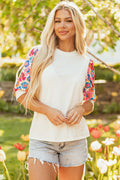 Beige Floral Puff Sleeve Patchwork Round Neck Top