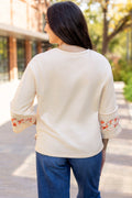 Sale Beige Flower Patch Graphic Exposed Seam Wide Sleeve Top