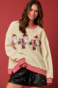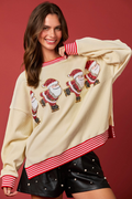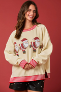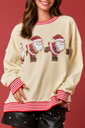 Beige Santa Skiing Graphic Striped Trim Corded Sweatshirt