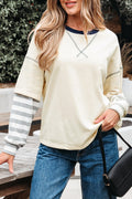 Beige Striped Patchwork Long Sleeve Round Neck Two-in-one Top