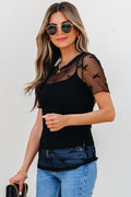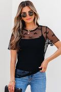 - This mesh top is sexy sheer.The bowknot dotted mixed print adds extra femininity and charm.The lettuce trim makes this mesh tee delicate.Great to match with jeans or skirts.