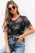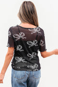 Sale Black Bow Printed Mesh Short Sleeve Top