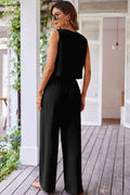 Sale Black Buttoned Vest Drawstring Wide Leg Pants 2pcs Set