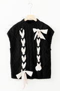 Black Cable Knit Colorblock Satin Bowknot Short Sleeve Sweater