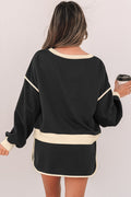 Black Color Contrast Loose Pullover and Lace-up Waist Skort Set