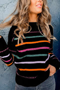 Black Colorful Striped Ribbed Trim Sweater