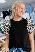 Black Contrast Leopard Ruffled Short Sleeve Ribbed Knit Top