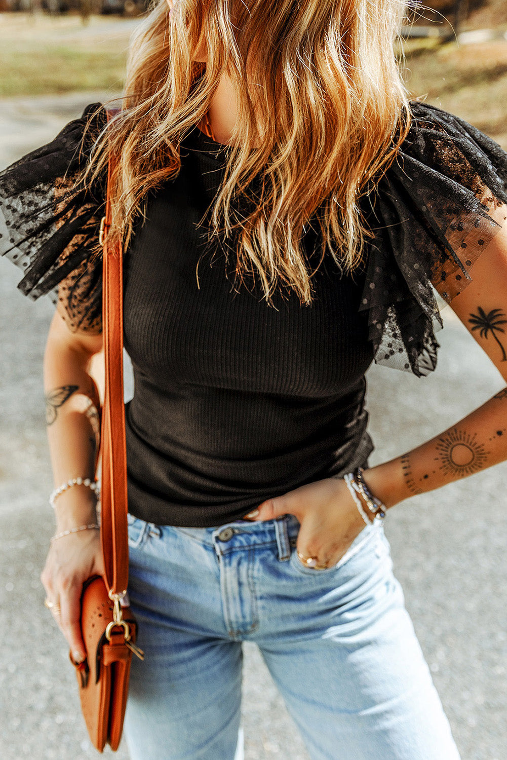 Sale Black Dotty Mesh Ruffle Sleeve Ribbed Knit Top