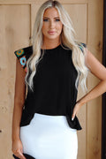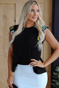 Black Floral Crochet Patched Sleeve Crew Neck Casual Tank Top