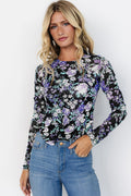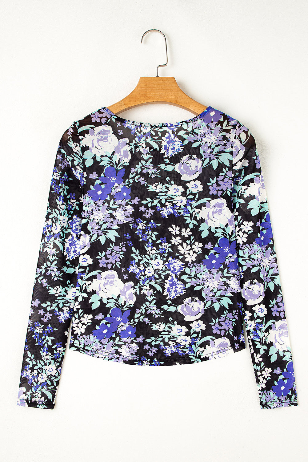 Sale Orchid Petal Floral Print Mesh Fitted Long Sleeve Top