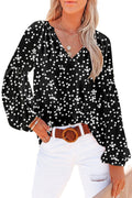Black Floral Print V Neck Long Puff Sleeve Top