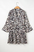 Black Leopard Print Buttoned Front 3/4 Sleeve Tiered Ruffled Hem Dress