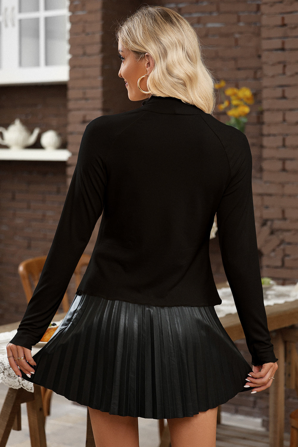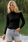 Black Ribbed Knit Lettuce Trim High Neck Long Sleeve Top