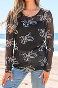 Sale Black Round Neck Bow Print Long Sleeve Mesh Top