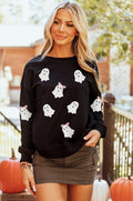 Sale Black Sequin Cute Bow Ghost Graphic Crew Neck Halloween Sweatshirt