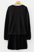 Black Solid Color Textured Knit Drop Shoulder Pullover Drawstring Shorts Set