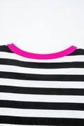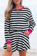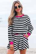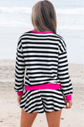 Black Stripe Contrast Ribbed Banding Long Sleeve Blouse Loose Shorts Set