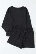 Sale Black Textured Long Sleeve Top and Drawstring Shorts Set