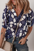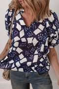 Blue Abstract Print Frilled Puff Sleeve V Neck Blouse
