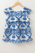 Blue Boho Print Flutter Sleeve Crew Neck Blouse