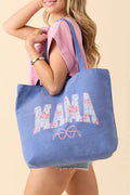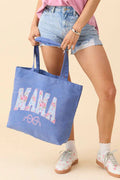 Blue Floral MAMA Letter Bow Print Canvas Tote Bag