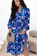 Blue Floral Peasant Sleeve Tiered Ruffle Midi Dress