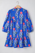 Blue Floral Print Button Detail 3/4 Puff Sleeve Ruffle Hem Dress