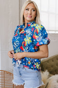Sale Blue Flower Print Collared V Neck Puff Short Sleeve Loose Blouse