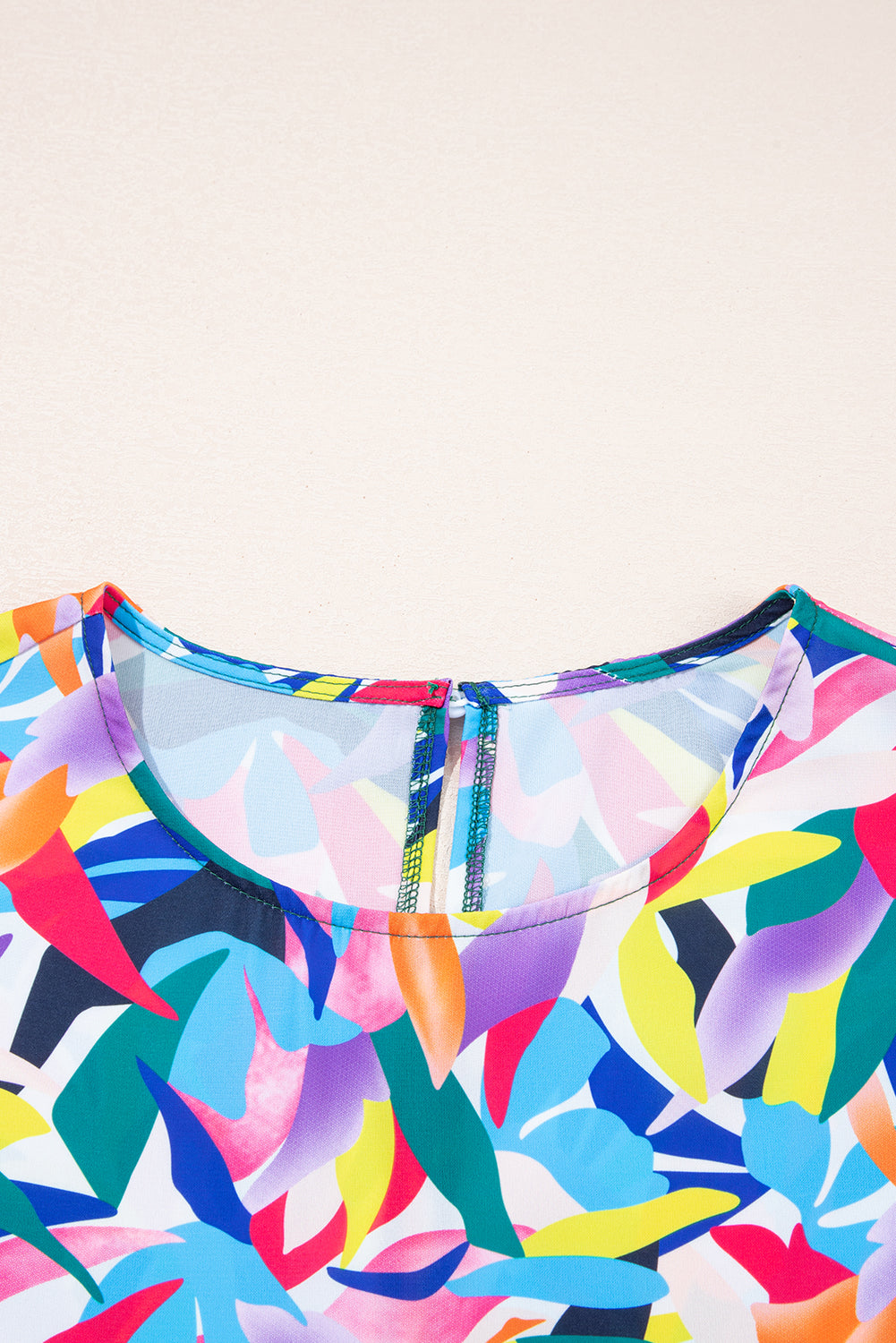 Rose Abstract Printed Puff Sleeve Square Neck Smocked Bust Tied Back Plus Size Dress