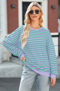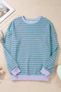 Blue Stripe Contrast Ribbed Trim Crossed Stitch Drop Shoulder Sweatshirt