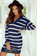Blue Striped O-ring Zip Collared Loose Sweater Mini Dress