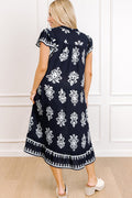 Blue Western Ethnic Print Notched Neck Short Sleeve Midi Dress