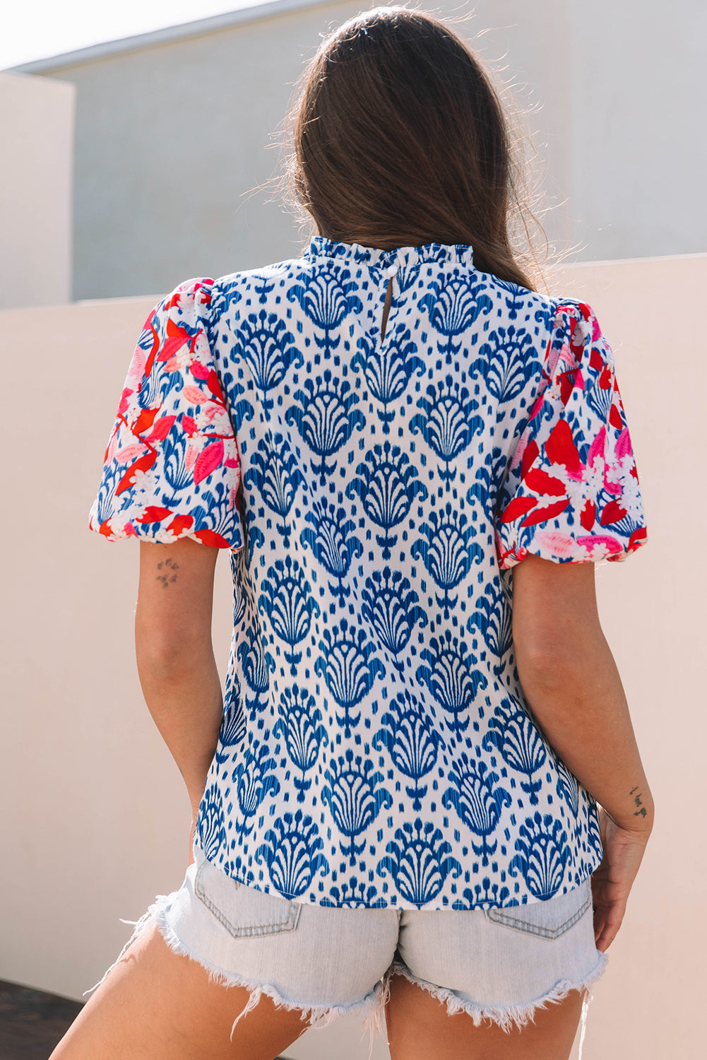 Sale Blue Western Fashion Print Floral Puff Sleeve Frilled Neck Blouse